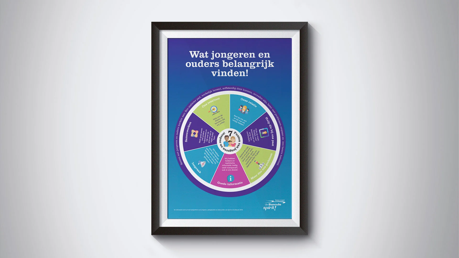 De jongeren en ouders van het fusie platform Spirit en Bascule hebben benoemd wat voor hen belangrijk is als ze hulp van Spirit ontvangen. Dit alles stond gedocumenteerd in een tekstbestand van meer dan 40 pagina's. Maar hoe gingen we dit nu delen met de rest van de organisatie? Door de informatie te comprimeren naar een sterke visual natuurlijk!